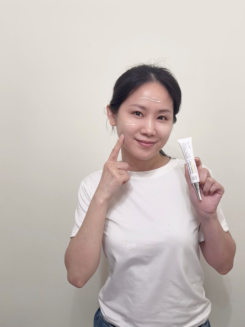 Cindy通常在完成保養及防曬後,取適量點在額頭、雙頰、下巴,指腹輕點拍開即可,鼻翼動態處稍微點拍就均勻了,整體妝感就很輕透感。