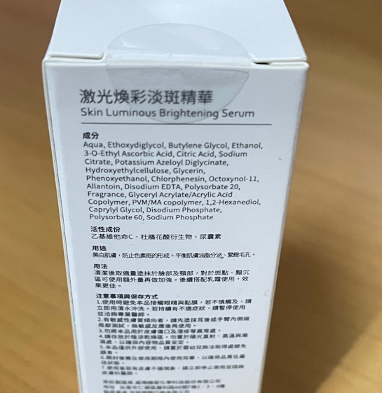 接著可以進行第二步驟,使用激光煥彩淡斑精華,其成分中含有乙基維他命C、杜鵑花酸酯、尿囊素及盧芭膠,一滴四效,提供高濃度的美白,改善痘痘與粉刺困擾,舒緩肌膚,為肌膚鎖水,達到長效保濕,幫助你甩開上述所提到的肌膚問題,2周後有效煥膚,讓你同時能保濕、修復、美白與緊緻毛孔,不僅可以用於日夜保養中,還能作為曬後急救的小幫手。
