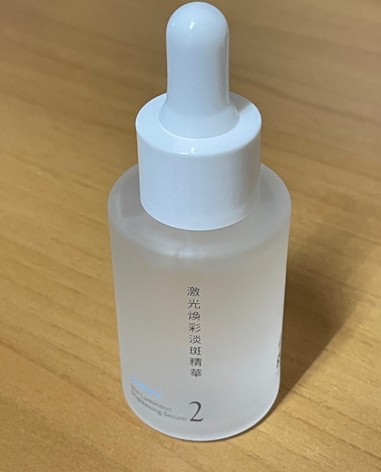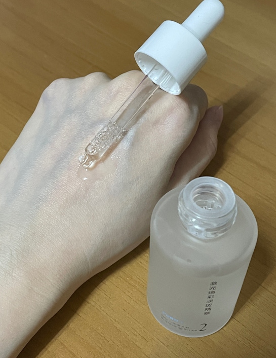 激光煥彩淡斑精華也是透明無色,但比機能水的液體再稠一點,但又不會稠到有濃稠感,在臉上很好推開,剛開始塗完後,肌膚會有些微黏感,但稍等幾分鐘皮膚表面的精華被肌膚吸收後,微黏感也隨之消失了。