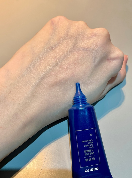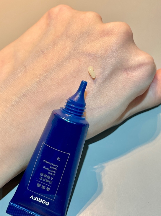 活膚亮彩A醇晚霜擠出來是白濁色,有點像凡士林的那種顏色,聞起來沒什麼味道,濃稠度比精華再稠一點,我個人認為有一點難去推開。雖然我是敏感肌,但我在使用時,肌膚都沒有什麼不適的感覺,只有遇到一次皮膚有微刺感,但這種感覺也一下子就消失了,沒有到不舒服的程度。