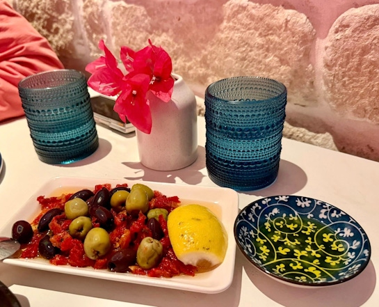 餐點一上桌就讓人眼睛一亮。主菜是經典的土耳其燉羊膝,羊膝直立擺放在綿密的薯泥上,外層燉煮得色澤誘人,醬汁濃郁而不膩。輕輕一切,羊肉便自然分離,入口軟嫩,帶著香料與肉汁交融的深層風味,搭配細緻滑順的薯泥,非常平衡,也讓人感受到土耳其料理在香料運用上的細膩與自信。來美國多年,竟然也開始喜歡吃醃橄欖,解膩的很!