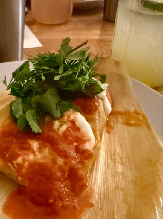 主菜是以玉米葉包裹的料理,淋上濃郁番茄醬汁,再搭配大量新鮮香草。刀叉輕輕切開,內餡柔軟細緻,與酸香醬汁融合得恰到好處。每一口都能吃出食材原味與廚師的巧思,沒有厚重負擔,卻十分滿足。