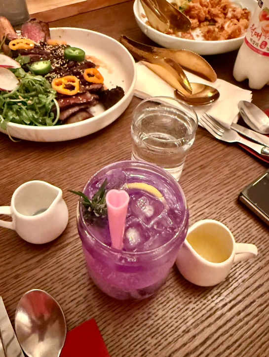 我們的慶生饗宴從一杯驚艷的紫色調酒開始。裝飾著迷迭香與黃檸檬,晶瑩剔透的冰塊襯托出迷幻的紫色,光看外型就已經讓人心情愉悅。