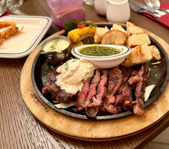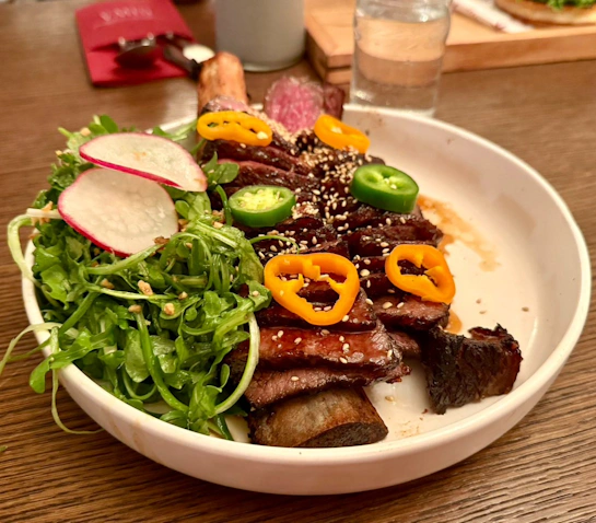 • 碳烤帶骨牛小排: 這是當晚的重頭戲。牛肉烤得恰到好處,保有迷人的肉汁,上面灑了芝麻並配上鮮艷的辣椒片與鮮嫩綠葉沙拉。一口咬下,肉香與特製韓式醬汁在口中爆發,讓人忍不住一口接一口。