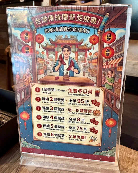 這間餐廳最有創意的地方,莫過於結帳時的「台灣傳統擲聖筊挑戰」!櫃檯前立著可愛的插畫看板,規則簡單明瞭: