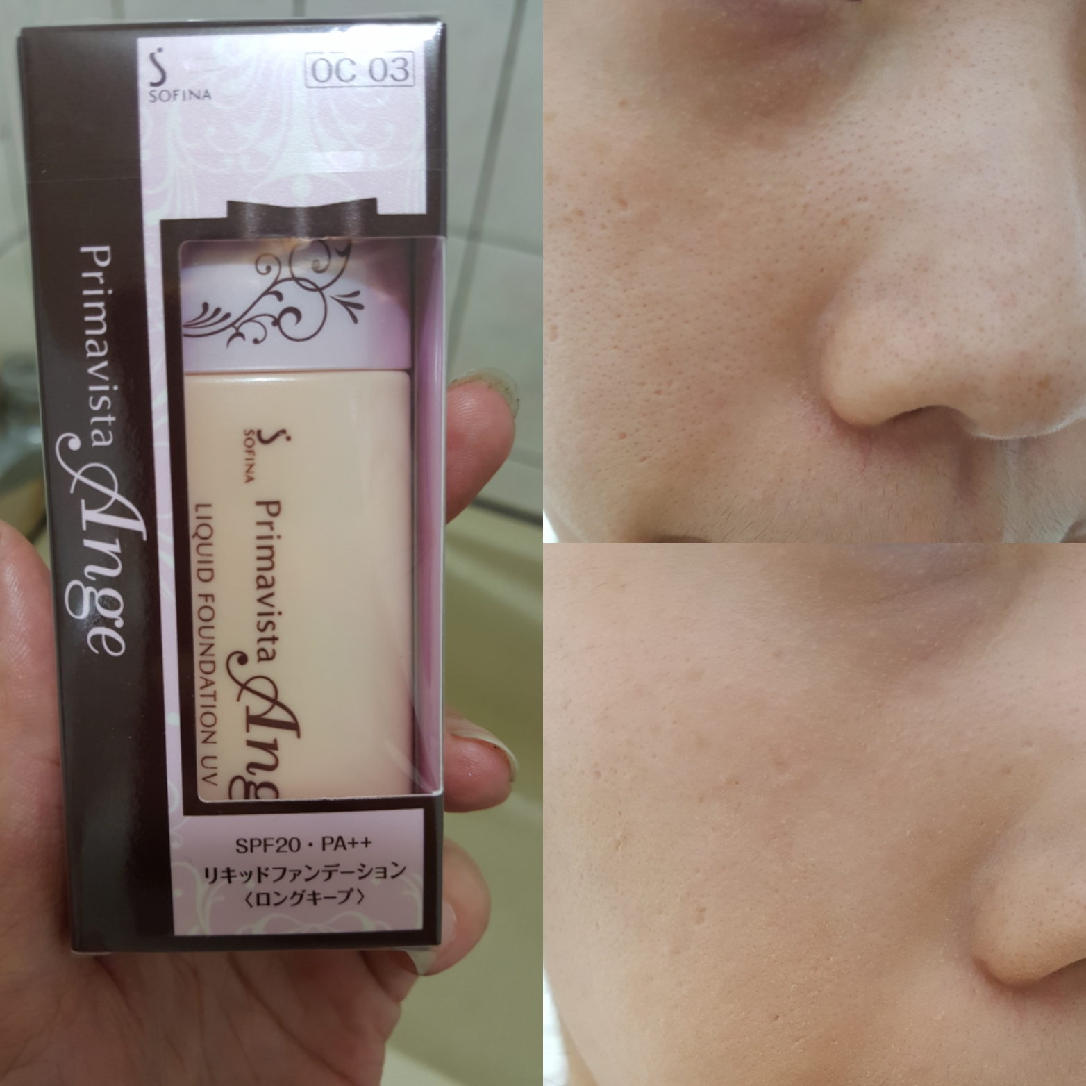 這次試用的是SOFINA Primavista Ange 漾緁 輕妝綺肌長效粉底液升級版 色號為OC 03明亮自然 在上妝前我只先噴了蜜濃 MINON保潤噴霧化粧水後以手指上粉,右上第一張圖為未上粉前,可以看到毛孔很粗大膚色也有些暗沉,右下圖為上粉後,可以看到膚色變得較為嫩白像是開了柔焦濾鏡,有些許遮瑕力但不強像是黑眼圈可能就需另外做遮瑕,矯正膚色但不會過白,不過感覺不到保濕所以上粉前需先自己好好保養補充水分才不會造成有點脫屑。