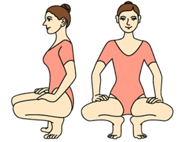 首先兩腳寬度與臀部一樣,將腳跟離地用力踮起腳,接著彎曲膝蓋緩緩往下蹲,然後將背部打直,雙腳膝蓋朝外打開約45度,整個人呈現「十」字狀,停留約5秒鐘,再慢慢回到最初的位置。想雕塑大腿的女孩們不妨可以試試喔!