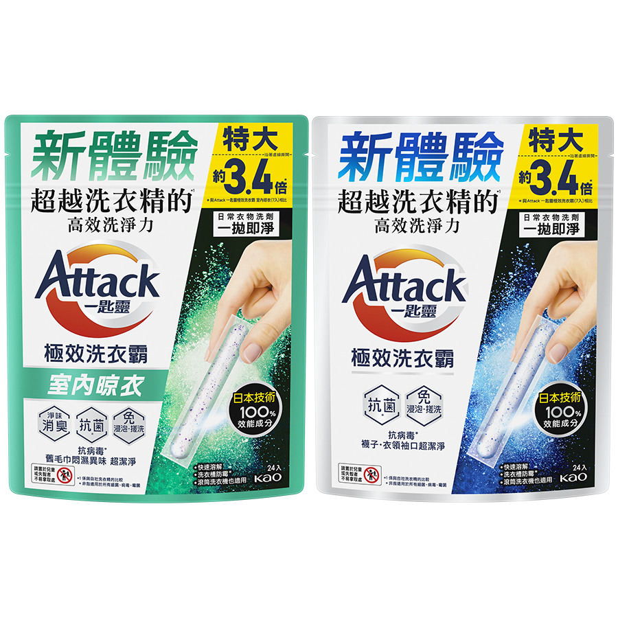 《Attack一匙靈極效洗衣霸》最高洗淨力加上劃時代劑型設計,掀起「洗衣交棒」風潮,創下每秒熱銷12支1紀錄!現在更推出全新「室內晾衣」款,帶動全台「洗衣接棒」新觀念!