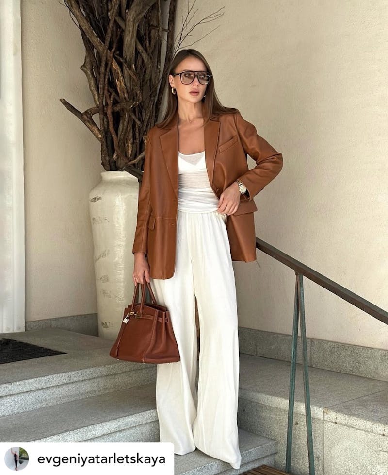 ▲摩卡慕斯色皮外套與白色透膚上衣的搭配,令人驚喜,再加上垂墜感十足的白色落地褲,既時尚又休閒!圖片來源:Instagram @evgeniyatarletskaya