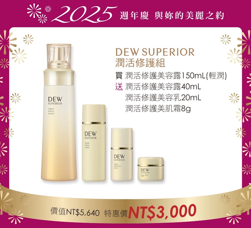 養成好膚質,保養基本功不能少! 全新升級「DEW SUPERIOR活膚系列」推出 潤活修護組,美容露、乳液、面霜一次擁有;資生堂「紅色超導奇蹟露」贈品加起來140ml等於買一送一太划算,囤起來超安心;敏弱肌必收「d program敏感話題」均衡水乳組,日常穩膚、水油平衡就靠它,Lily Hsu愛用同款超值擁有!