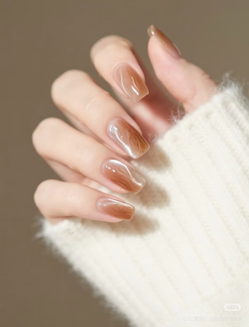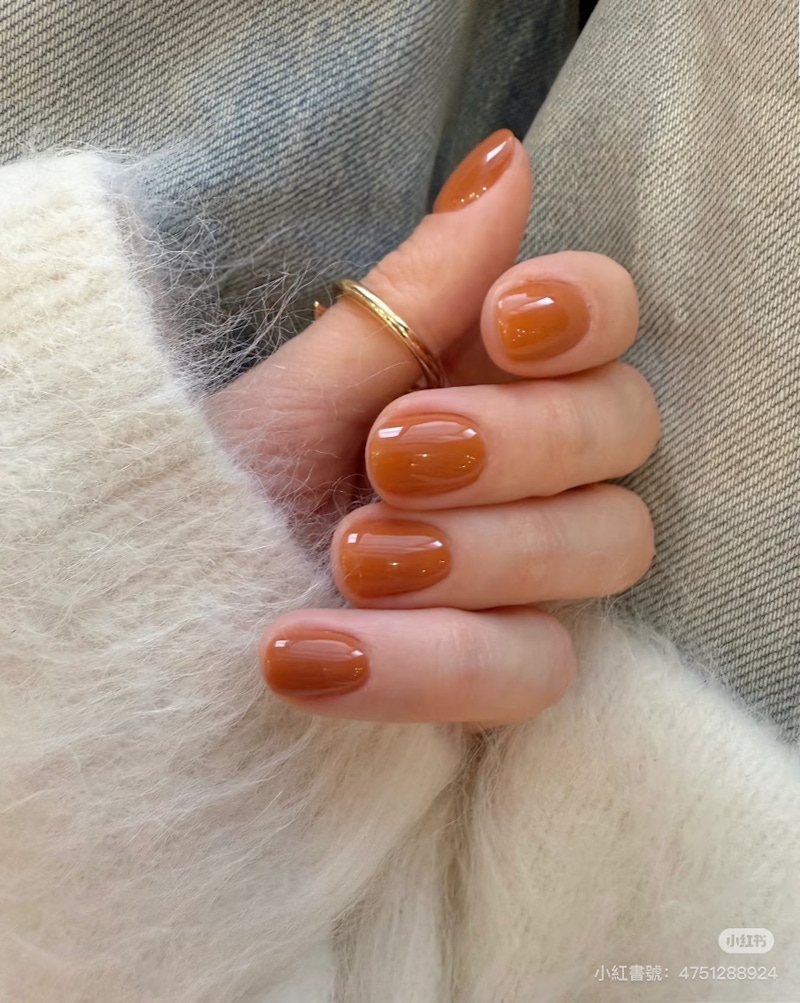 焦糖棕是秋天最經典的代表色之一,色澤濃郁卻不厚重,能夠自然的烘托出沉穩又溫暖的秋日氛圍。這個色調不張揚,卻有種內斂的高級感,非常適合在涼爽的季節中為指尖增添柔和的光彩。不管是單色塗抹,還是搭配金箔、漸層等設計,都能展現出細膩的層次變化。飽和度適中、襯膚效果出色,焦糖棕既不挑膚色,也不容易看膩,完全是秋季最不會出錯的經典選擇。