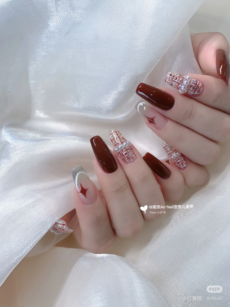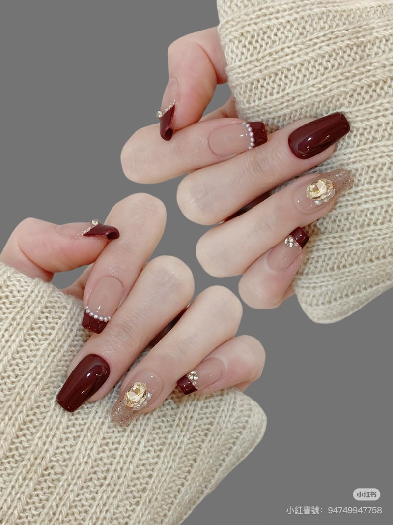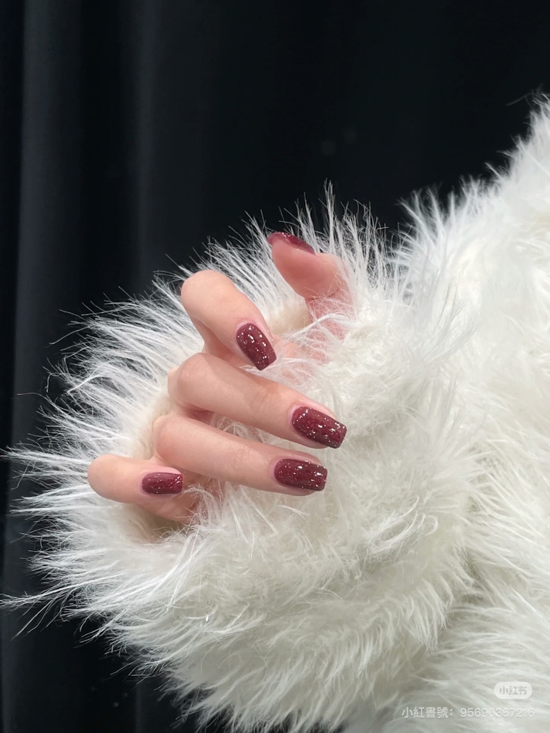 酒紅色配上細閃亮片,會讓整體多了一點輕盈與流動感,同時也可以讓酒紅色不會顯得過於厚重。亮片的存在能讓指尖在光線下呈現出柔和的閃點,看起來愉悅又有溫度。這個款式很適合年底節慶、生日、聚會……或是想替日常生活增添一些「好心情」的時候。它保留了成熟度與穩定感,同時又多了一絲俏皮、活潑的氛圍,整體看起來自然、乾淨又不造作,女孩們一定要試試看!
