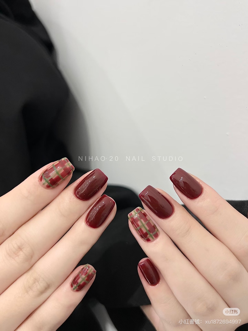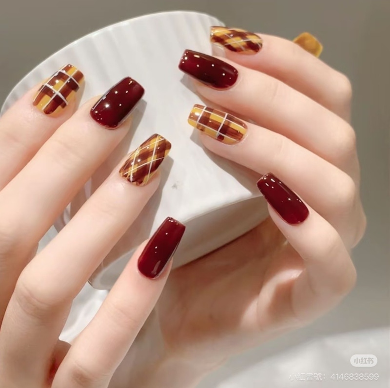 ▲酒紅格紋美甲有著濃厚的秋冬氣息。圖片來源:小紅書 @冬冬 bgo