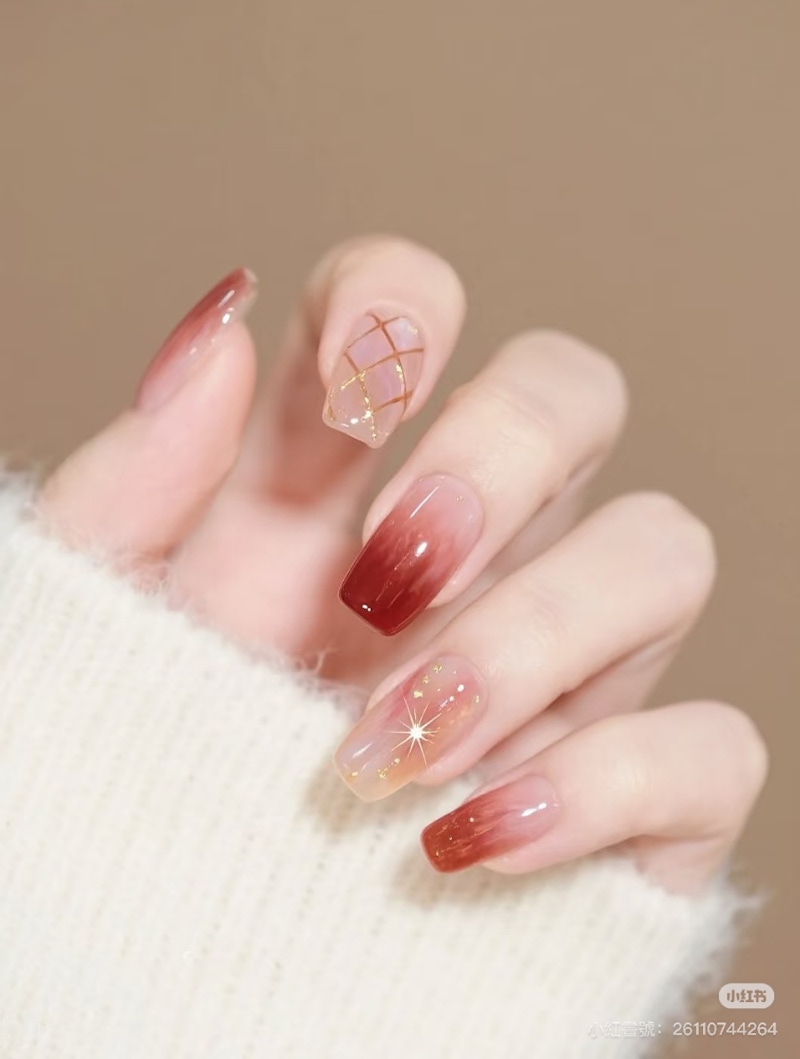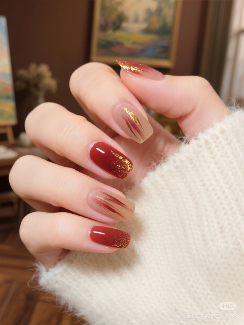 酒紅色搭配金箔元素,會讓美甲呈現柔亮的層次感,不會過於太華麗,但會比純色更有精緻度。將金色融入在酒紅色之中並不是為了要塑造明顯的對比,而是補上了一點細節亮度,讓指尖看起來更像是被精心整理過的一樣。這款美甲特別適合年底聚會、新春期間,或是想為指甲增添一點貴氣氛圍的時候,它既帶有成熟、氣質的感覺,也不會太浮誇、搶鏡,是一個「剛剛好」的小亮點,給人一種溫暖、精緻又有品味的印象。