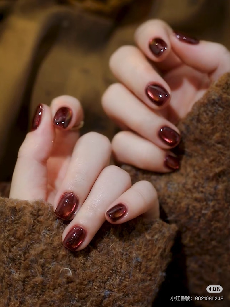 ▲酒紅毛呢美甲的視覺重點在於「溫暖感」。圖片來源:小紅書 @安奈ㄦ美甲美睫 SALON