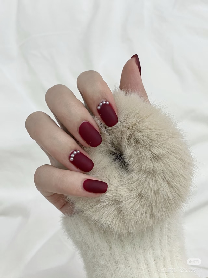霧面酒紅會讓美甲色調變得更加柔和,整體看起來既沉靜又安穩,適合喜歡低調質感的人。這種設計給人一種溫柔、穩定的感覺,不會搶走造型的風頭,卻能在細節中展現品味,特別適合秋冬搭配針織衫、大衣等單品,讓整體的視覺效果變得一致又順眼。霧面處理會強調顏色的深度,所以指尖看起來會更有存在感,但霧面酒紅又能同時保留柔和度,是非常適合加入此元素的色彩,質感滿滿。