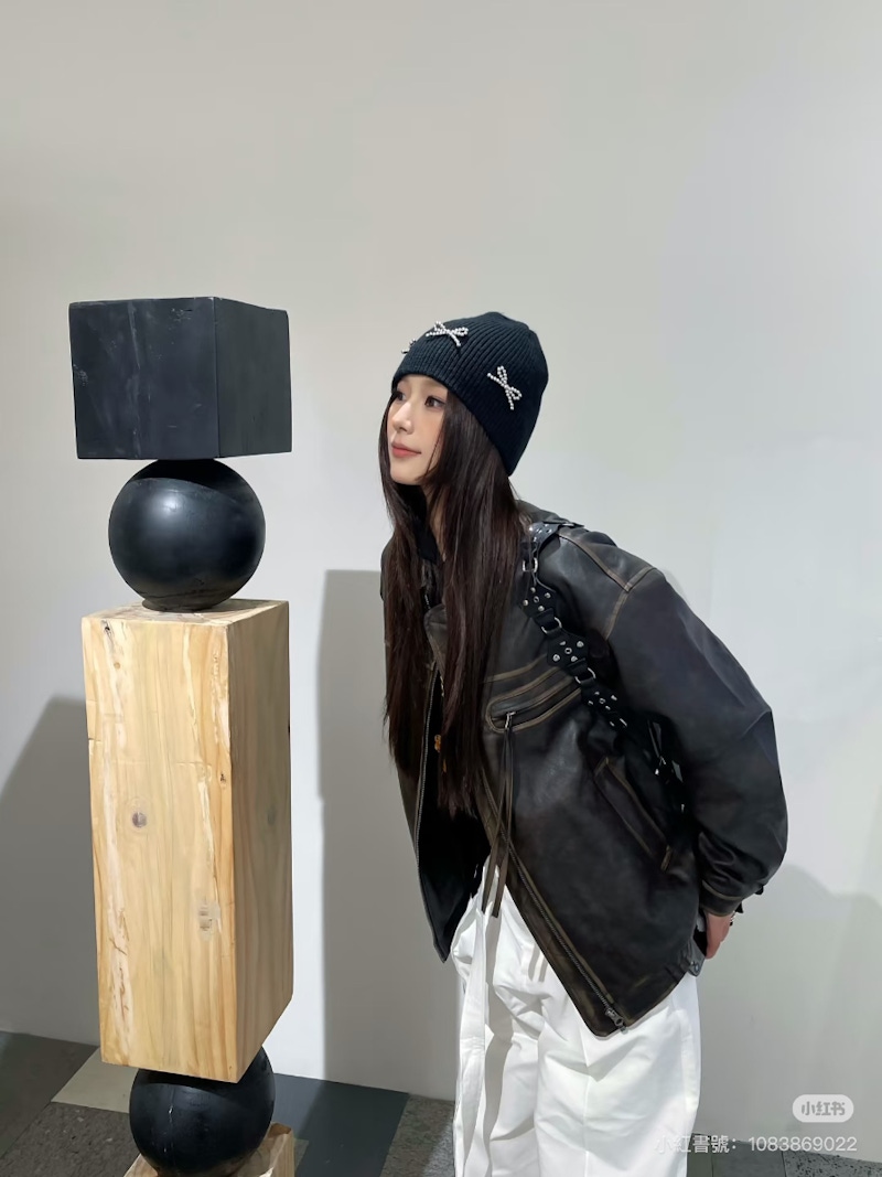 ▲在皮衣造型中加入冷帽,能為穿搭增添一點街頭感與隨性氛圍。圖片來源:小紅書 @Hush