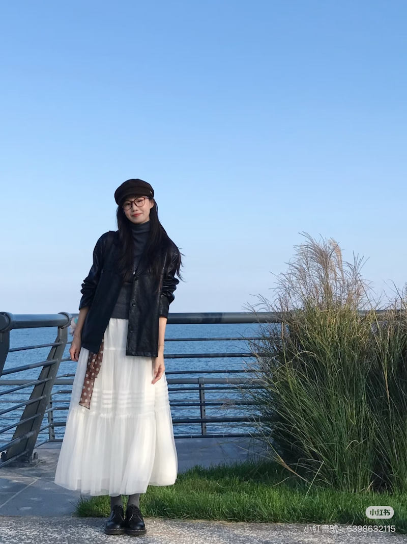 ▲皮衣搭配長裙是許多人喜歡的秋冬「甜酷混搭」。圖片來源:小紅書 @香辣蟹蟹