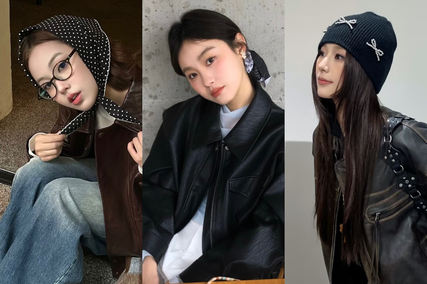 近幾年很流行在髮型中加入絲質頭巾,讓造型多了一點復古、優雅的感覺。皮衣常常給人一種「個性鮮明」的印象,搭配頭巾時會形成有趣的風格碰撞;建議選擇柔和色調、細緻花紋或是帶有光澤感的頭巾,這些款式都能中和皮衣的硬挺感。頭巾的綁法可以根據個人習慣來調整,不管是包頭、綁在髮尾處,還是當成髮帶都很適合,在視覺上也會比單穿皮衣來得更有層次與個人特色。
