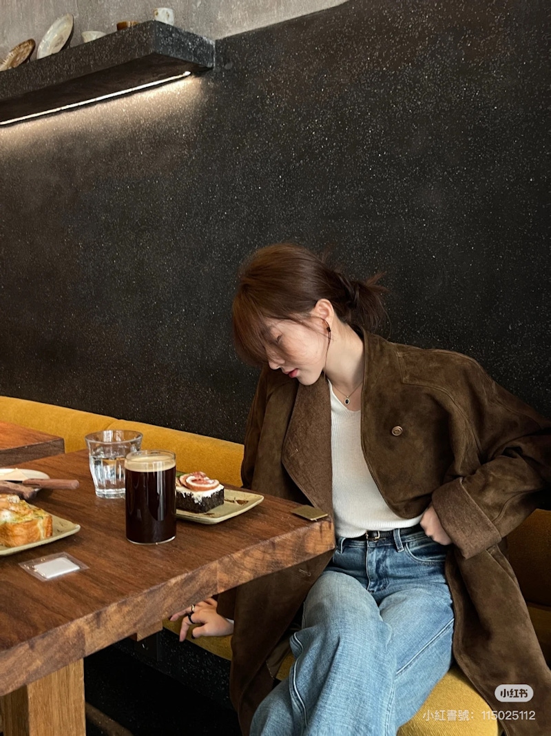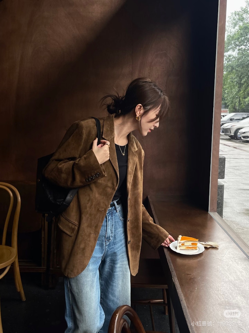 ▲麂皮西裝外套融合了正式的線條感與柔和的質地。圖片來源:小紅書 @heylin