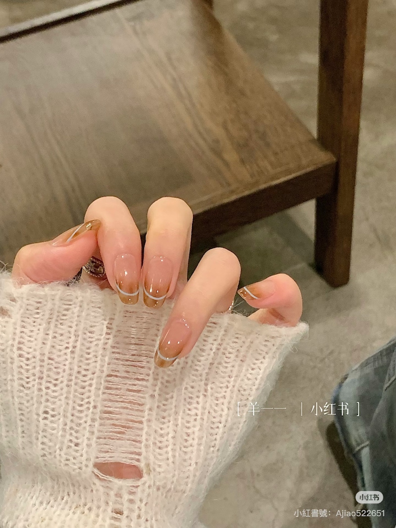 琥珀暈染法式美甲散發著秋冬的暖調氛圍,琥珀色的深淺層次會讓指尖呈現出一種自然流動的光影效果。搭配裸透底色還能讓琥珀質感更加的突出,就像是在指尖封存了一小片暖色光影一樣,美麗又動人。這個款式整體給人一種沉穩又充滿細節的印象,質感厚實卻不厚重,特別適合秋冬季節,是成熟、優雅的代表款式。