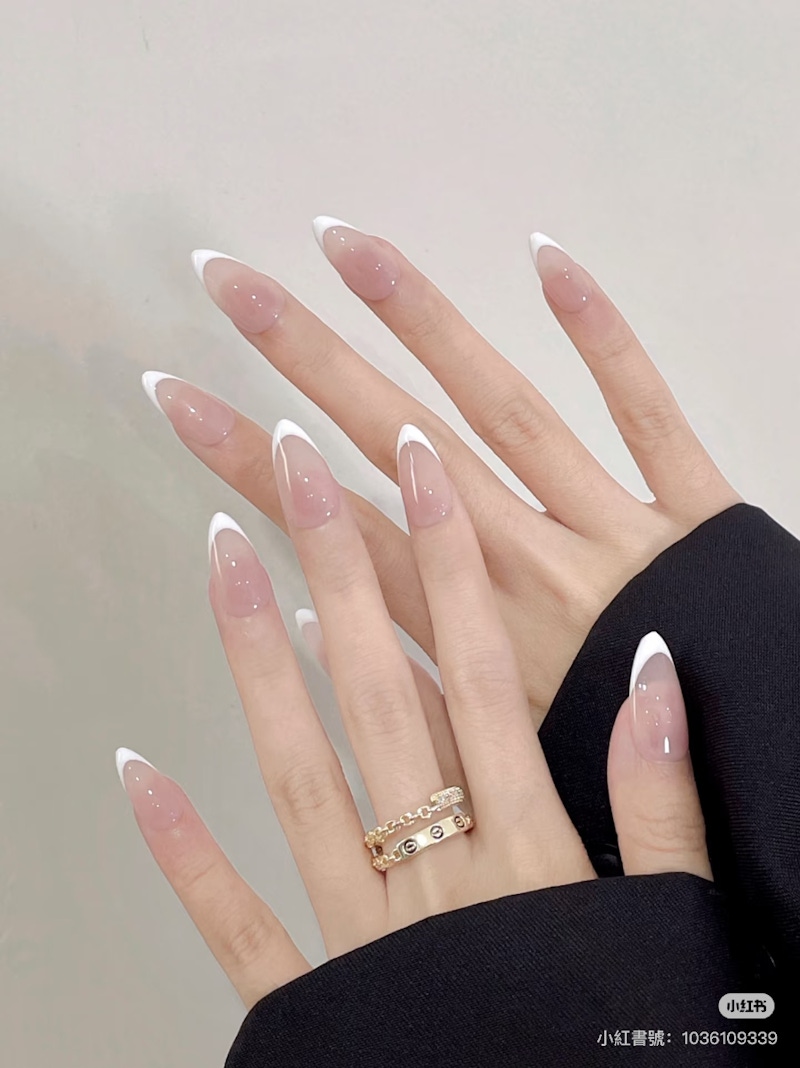 漸層法式美甲以柔和的色彩過渡為最大亮點,指尖與底色之間沒有明顯的界線,而是以自然暈染的方式呈現出輕透的光感。色彩變化輕盈、細膩,讓指尖看起來也會更加修長、柔美。不管是奶白色到裸粉色的柔和漸層,或是帶點霧感的中性色調、莫蘭迪色系,都能營造出氣質且優雅的視覺效果;既乾淨又純粹,是非常百搭的法式風格。