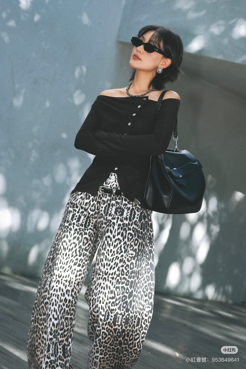 豹紋長褲是展現大膽個性、挑戰高難度搭配的時尚單品,建議可以選擇硬挺面料、緞面材質、西裝布料等質感較佳的款式,看起來會更有精緻度。而在搭配上,最安全的做法是採取「上素下花」的策略,可以搭配黑色、白色、米色的一字領上衣、針織衫或高領毛衣,利用上半身的沉穩色調來中和豹紋的複雜性。此外,選擇低飽和度的灰色與藍色豹紋,也能有效降低視覺上的喧鬧感,讓豹紋長褲成為秋冬季節中的吸睛焦點。