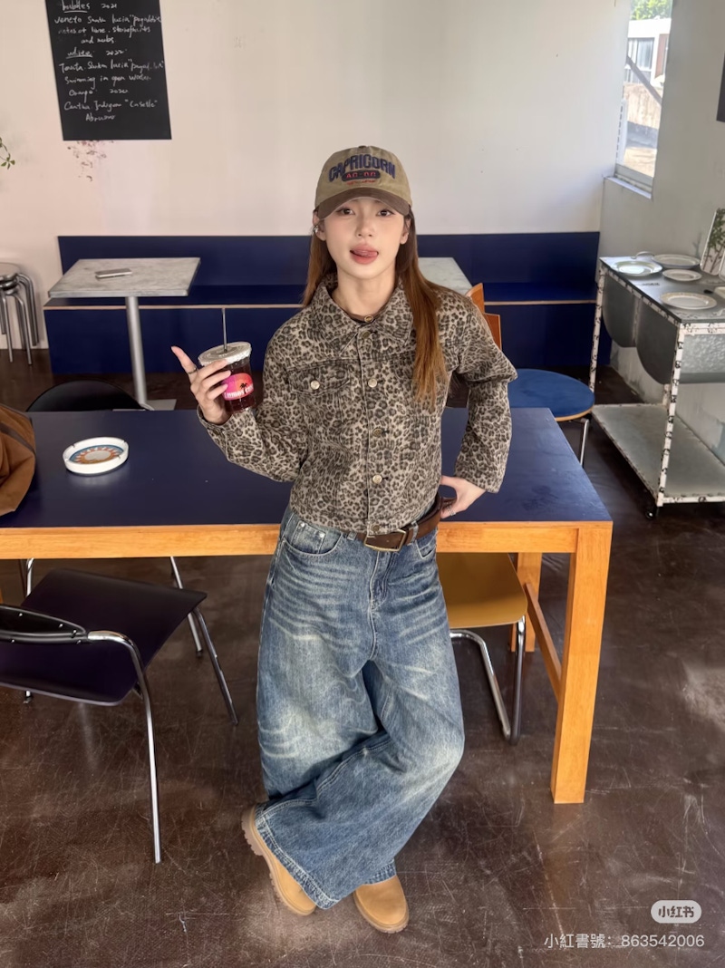 豹紋夾克是打造率性街頭風格的秋冬穿搭神器。夾克本身的版型就帶有中性氣場,能夠平衡豹紋的女性化狂野感,展現出甜酷、帥氣的風格。在搭配上,務必要選擇簡單、素色的內搭,例如:白色 T 恤與針織上衣、牛仔褲,或是成套的黑色棉質套裝,讓豹紋夾克成為唯一的視覺亮點。這種簡單、內斂的內搭策略,能夠確保造型的焦點集中,避免穿搭過於混亂,是初次嘗試豹紋元素的首選。