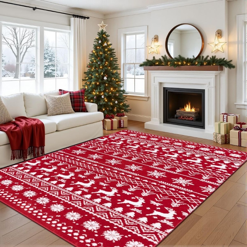 地毯在視覺上會佔據較大的面積,因此選擇聖誕主題的地毯能夠快速提升整個空間的節日氣氛。可以選擇圖案較為簡潔、色彩溫和的聖誕圖案,例如:雪花、簡約格紋、抽象的松針圖案等,避免過於複雜的視覺干擾。將地毯鋪在聖誕樹下方或是客廳中央,不僅可以提供柔軟、溫暖的觸感,還能為空間定義出溫馨、舒適的節慶區域,絕對是聖誕節必備的佈置單品之一。