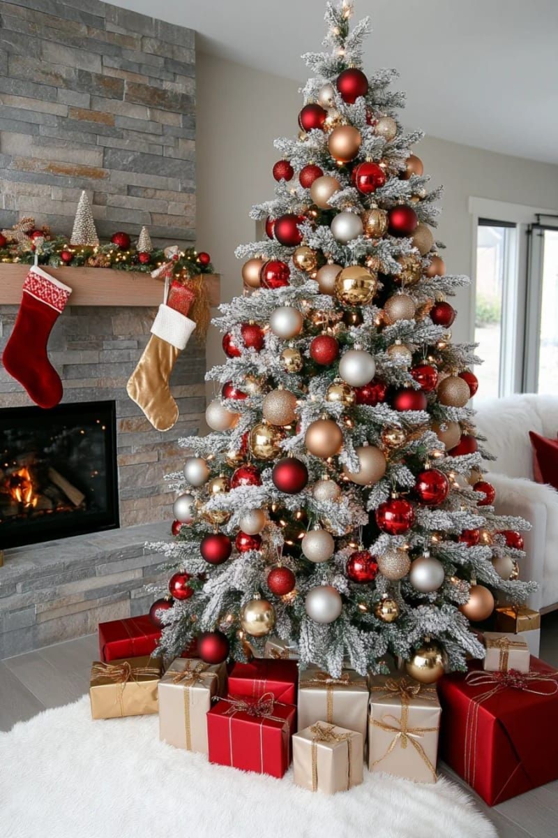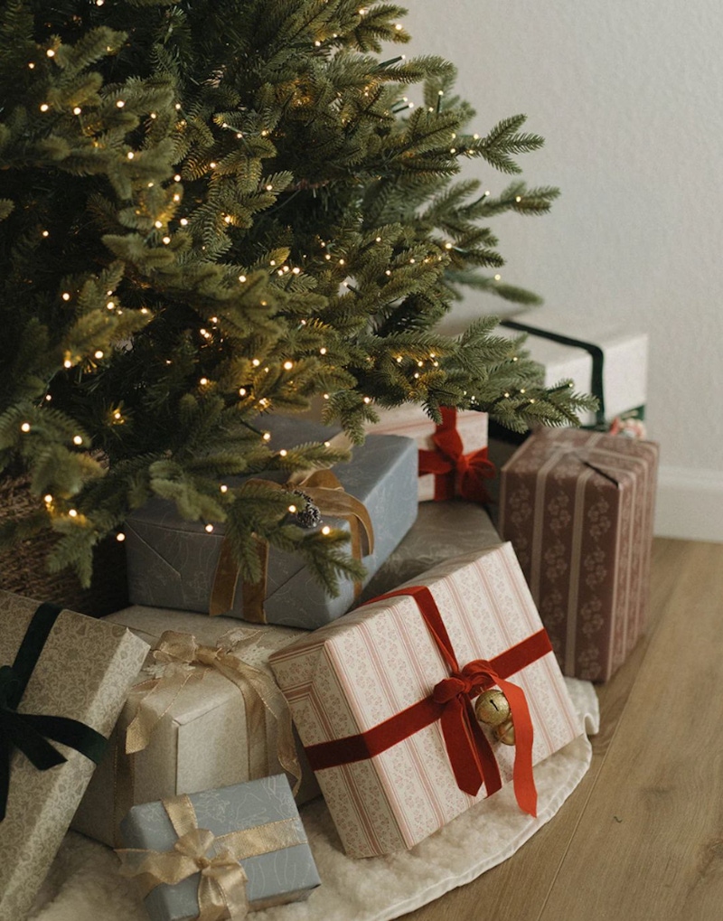 在聖誕樹下堆放包裝精美的禮物盒,是極具視覺吸引力的佈置方式;即使這些盒子是空的,也能營造出期待與歡樂的節日景象。建議選擇不同尺寸的禮物盒,並使用質感統一但顏色互補的包裝紙與緞帶,像是:霧面金、絲絨紅、深綠色⋯⋯讓禮物堆看起來既豐富又有層次感,成為聖誕樹周邊最重要的點綴裝飾。