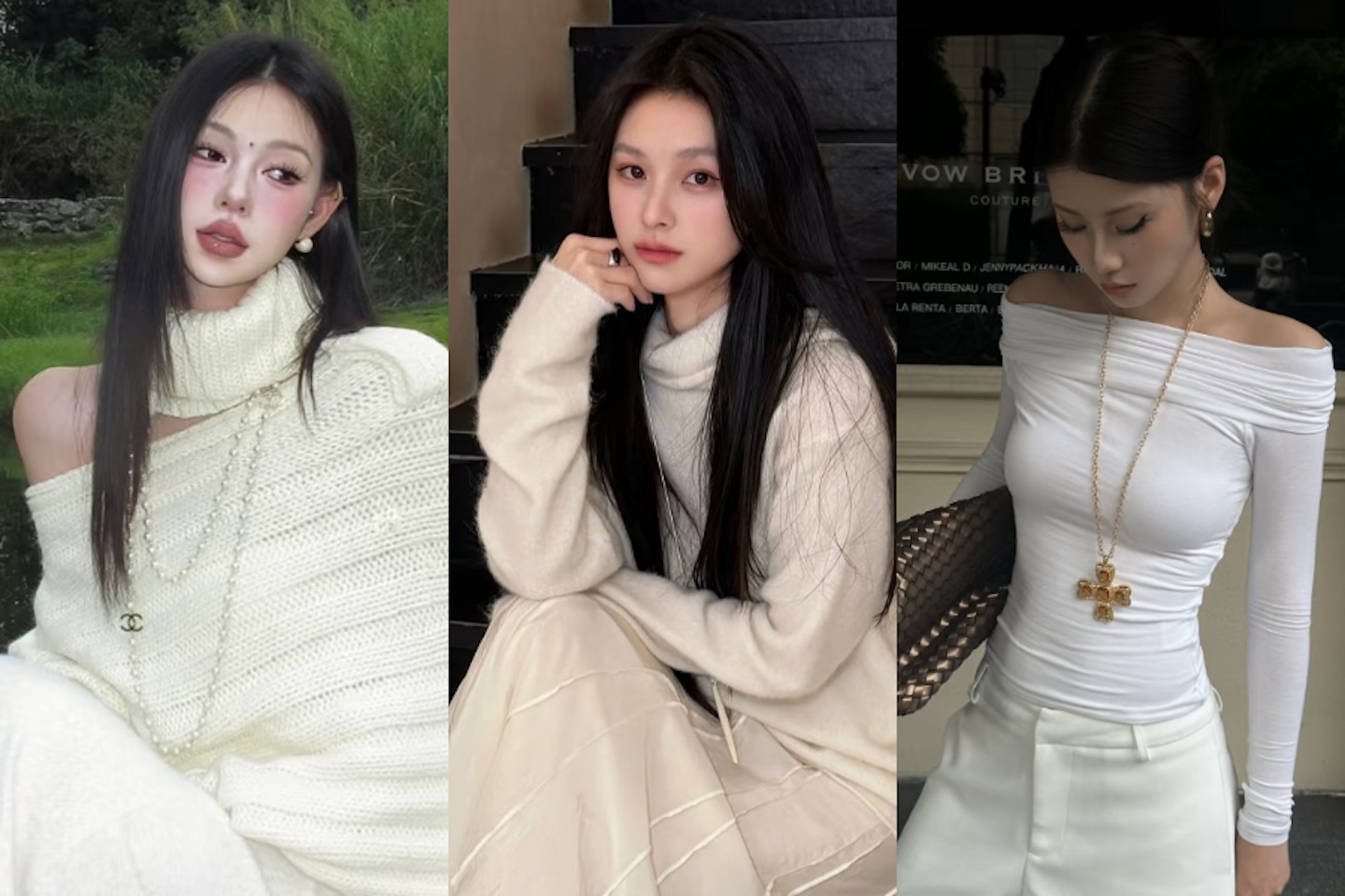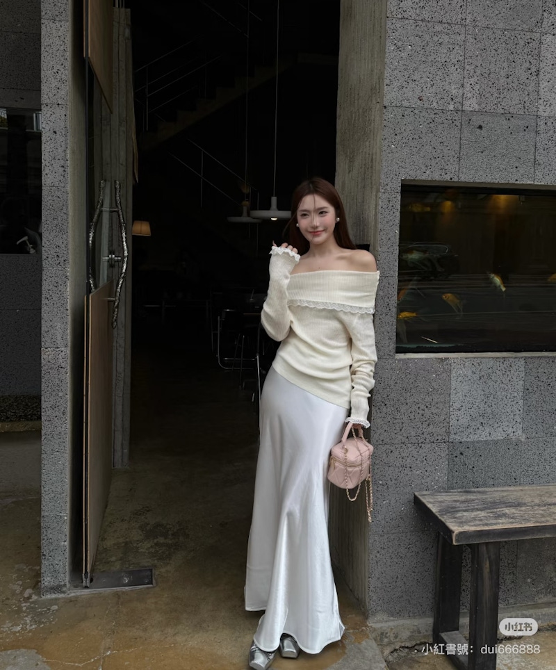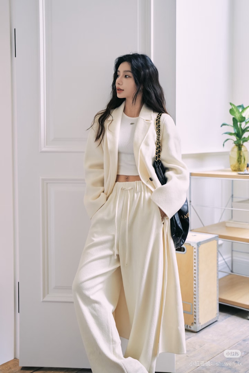 全白造型最容易出現的問題,就是視覺上的「扁平感」,想要避免穿搭過於單調,關鍵在於:材質的對比與堆疊。建議選擇纖維特性差異明顯的單品進行組合,像是以紋理鮮明的粗針織毛衣,搭配帶有光澤感的緞面長裙;透過粗糙與滑順、厚實與輕薄之間的交錯對照,讓雲舞白在光線變化下呈現出更加豐富的視覺深度,這樣即使全身同色,也依然能夠保有層次分明的高級質感。