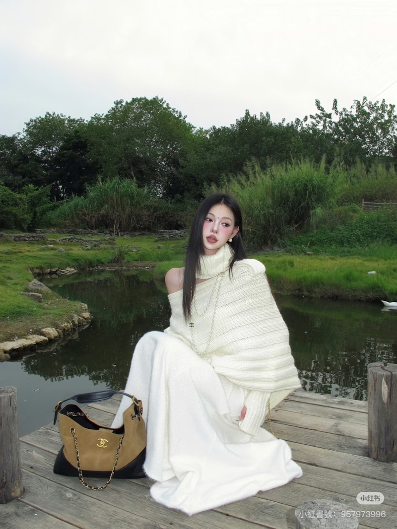 雲舞白與針織材質本來就十分契合,能夠輕鬆營造出柔和的氛圍感。不管是帶點絨毛感的馬海毛,還是觸感細緻的羊絨,針織的層次與質地,都能把雲舞白的柔軟感襯托的更加明顯。可以選擇一件寬鬆的針織長裙或是成套的針織套裝,並利用它的垂墜線條與溫暖的包覆感,營造出一種隨性、無害且極具品味的慵懶氣質。這樣的風格低調又不張揚,質感也相當高級,給人一種從容、舒服又耐看的視覺印象。