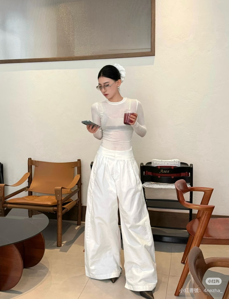 若隱若現的層次感,是讓全白造型不顯厚重的一大關鍵。帶有透視感的雪紡、蕾絲、透膚上衣,本身就能替雲舞白帶來輕盈度與空氣感;這種半透明的材質,會隨著身體的動作而產生自然的層次變化,使全白造型看起來不再單一、呆板,反而還多了一點呼吸感。原本簡單的白色,因為材質的細節而變得柔軟、有層次,同時更散發出一種浪漫、細膩的氛圍,讓全白穿搭不只乾淨,還變得更耐看、更有記憶點。