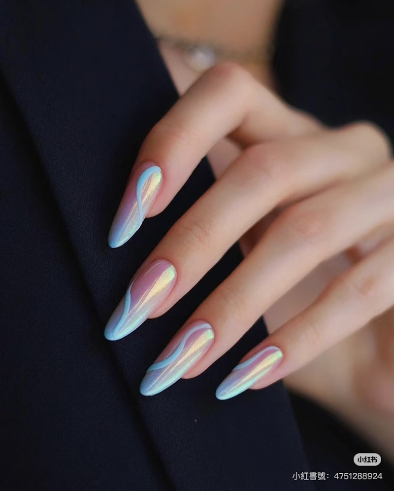 ▲冰川藍漸層線條鏡面美甲給人清爽又夢幻的感覺。圖片來源:小紅書 @purplecream_