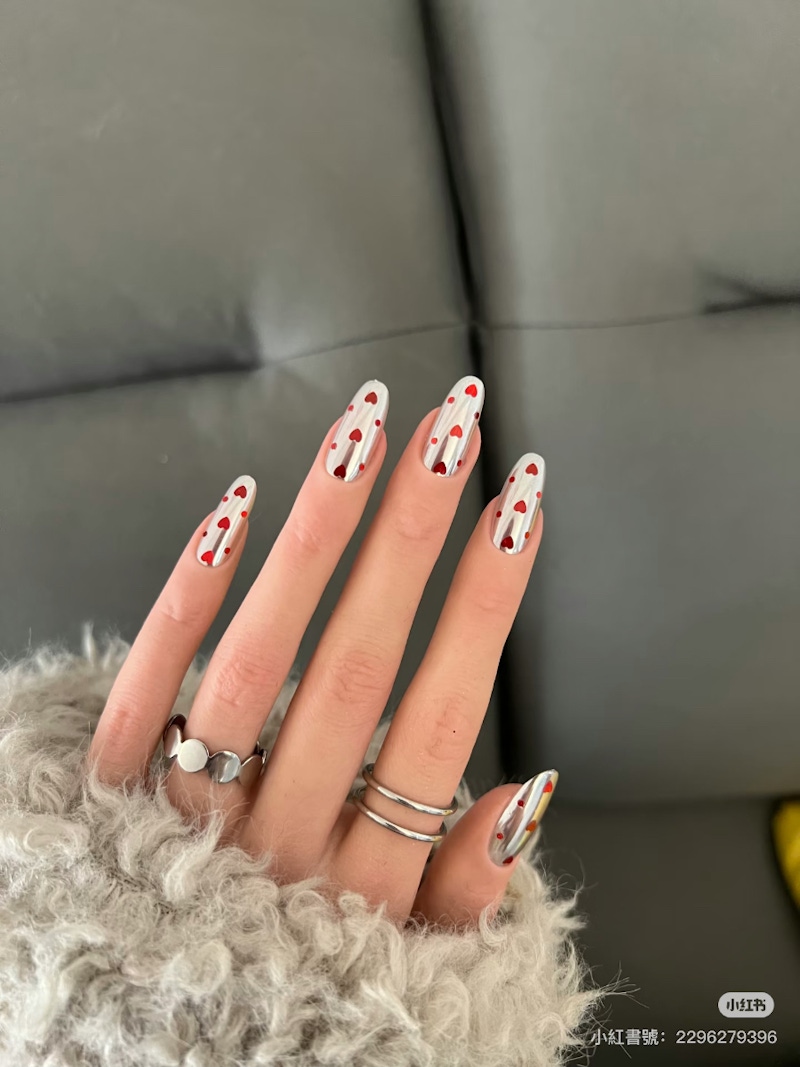 將可愛、俏皮的紅色愛心元素與冷調的銀色鏡面結合,能夠碰撞出鮮明又有態度的甜酷氛圍。滿版的心形、圓點圖樣在甲面上展現鮮明的存在感,讓造型變得更活潑、更有記憶點,而金屬光澤的加入,則巧妙的削弱了愛心給人的甜美印象,使整體風格更加俐落、有個性。這樣的設計既能保留童心與趣味感,又能符合現代的審美,特別適合想要展現獨特風格與自我態度的人。