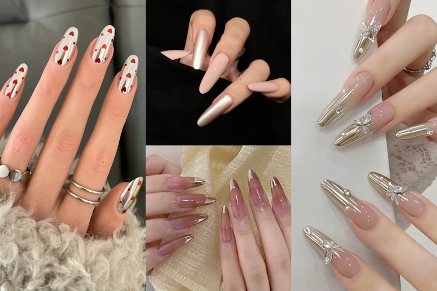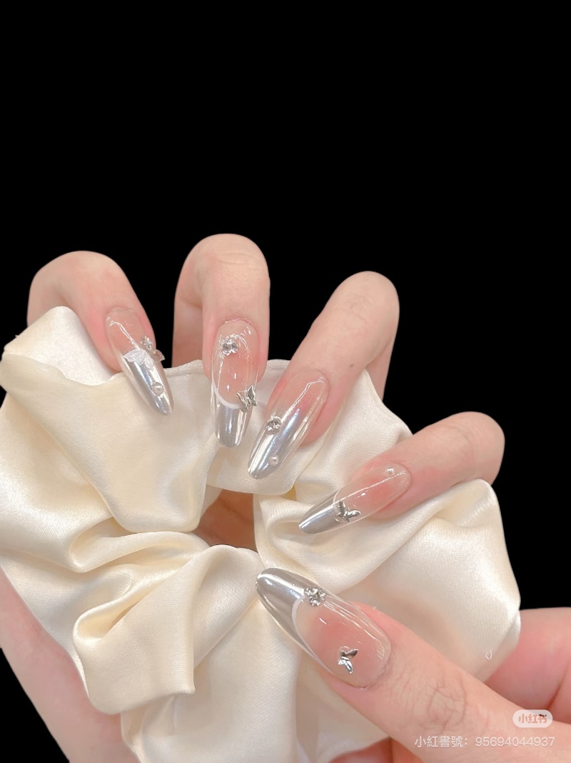「鏡面美甲」是一種利用特殊「鏡面粉末」在指甲表面打造高反光效果的美甲款式,透過在彩色底膠上刷拭鏡面粉,再以封層膠固定的手法,呈現出如同鏡子一般平滑、明亮的金屬光澤;鏡面粉本身的遮蓋力較高,無論搭配什麼樣的底色,都能形成乾淨、無瑕疵的玻璃質感,甲面也會顯得更加平整。這類美甲最大的優勢在於變化度極高又不顯複雜,經典的銀色鏡面百搭、不挑膚色,法式鏡面則能在優雅的輪廓中加入俐落光感,展現「剛柔並濟」的氛圍;而粉金、玫瑰金等色調,也能透過跳色、漸層或是立體設計來增加層次。這種百搭與高級兼具的特性,使得鏡面美甲的人氣持續攀升,不管你/妳是偏好極簡造型還是個性風格,一定都能找到屬於自己的鏡面呈現方式!