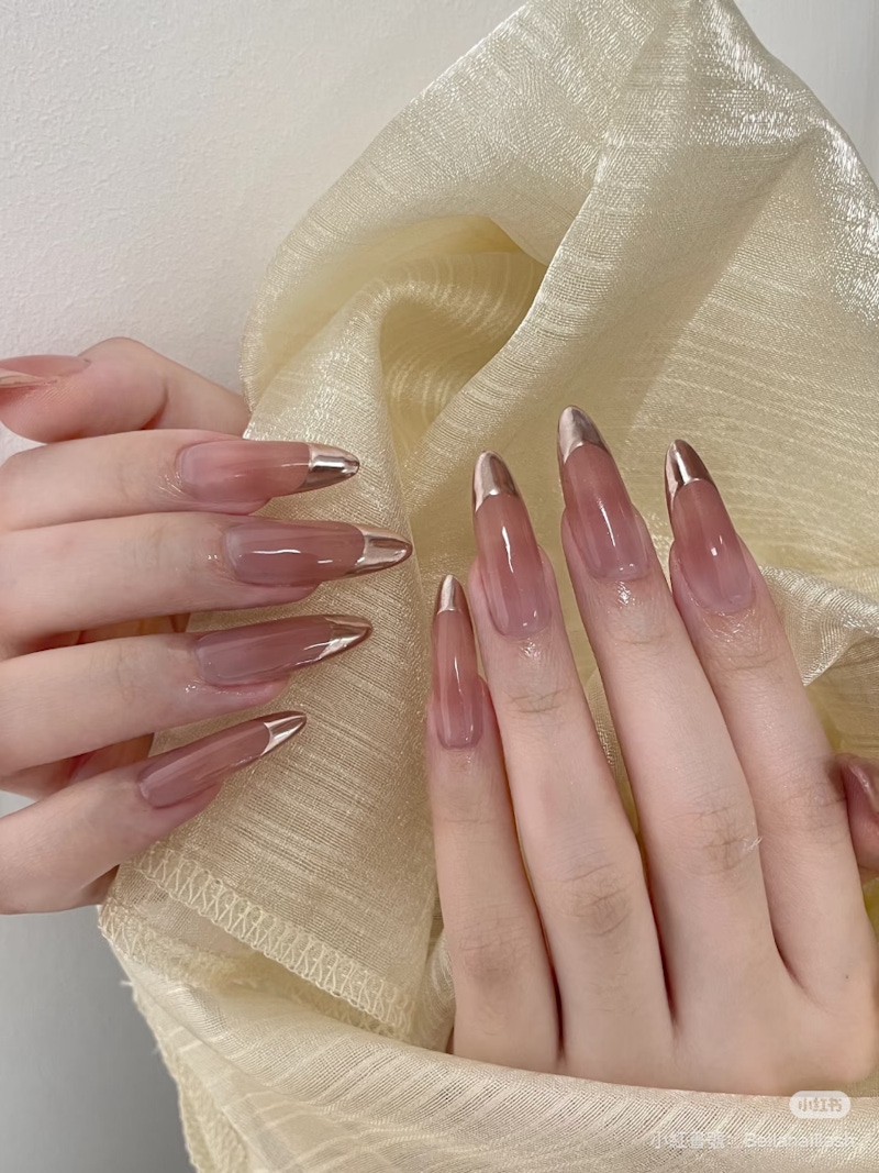 與銀色相比,香檳色更能展現溫潤、柔和的光感,結合法式設計後,還會散發出優雅又內斂的名媛氣息;鏡面的反射讓甲面呈現出金箔似的閃耀層次,華麗卻不浮誇。這樣的色調對偏黃膚色的姐妹們相對友善,不只不顯蠟黃,還能讓指尖看起來更加明亮。香檳色法式鏡面美甲既經典又耐看,適合各種正式場合,不只能在細節中自然展現優雅、從容的成熟魅力,還能讓整體造型顯得更有質感與完成度。