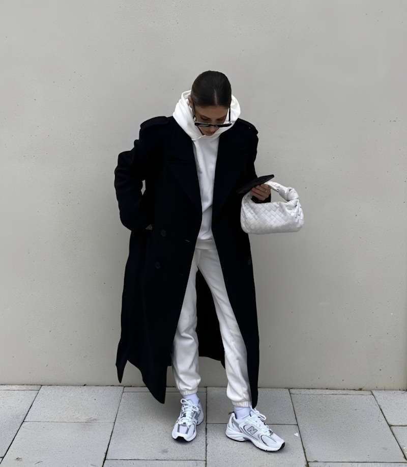 單穿運動套裝有時容易顯得過於隨興,這時候,「外搭層次」就是能夠提升時髦度的關鍵。在運動套裝外面披上一件長版大衣或是硬挺的西裝外套,就能瞬間中和掉運動服的家居感,注入正式、高級的氣場。這種「混搭法」利用異材質的堆疊,讓柔軟的棉質與俐落的剪裁形成鮮明的對比,不僅增加了視覺的層次深度,還讓這套造型變得更適合穿梭於都市街道,展現出毫不費力的優雅氛圍。
