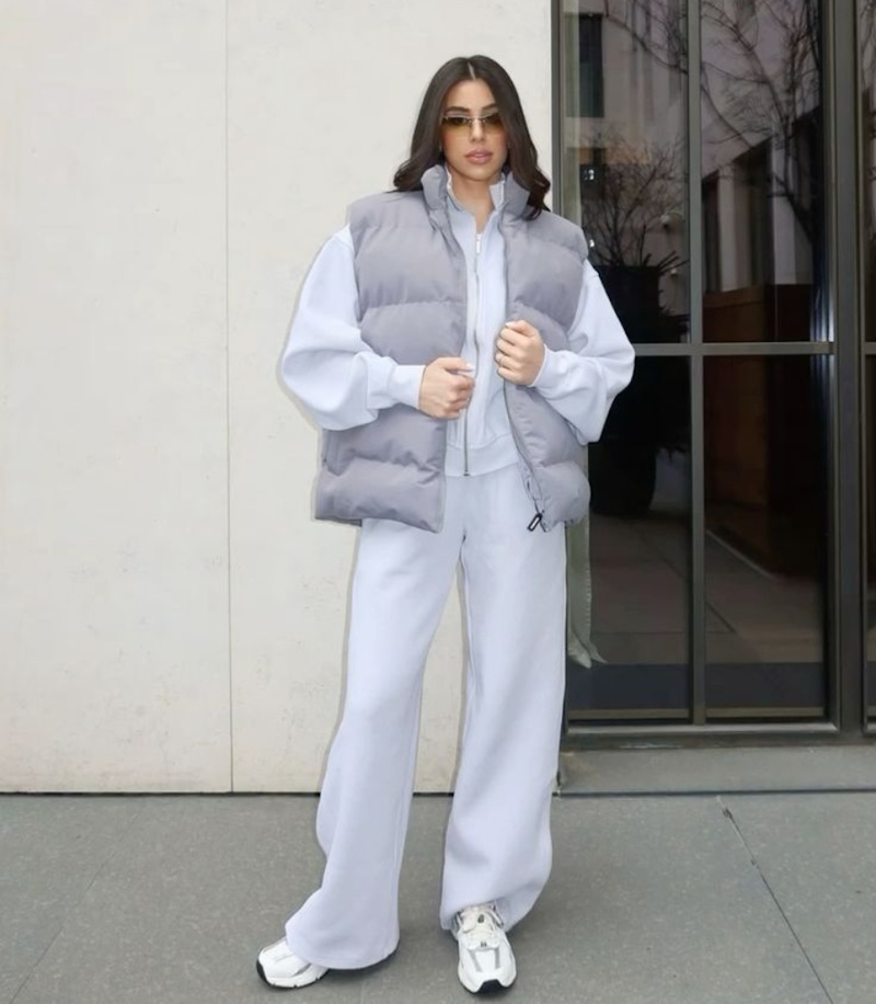 在選擇棉質運動套裝時,要盡量避開大面積的圖騰、浮誇的字體與亮片裝飾。純色系最能凸顯布料本身的質感與裁切的線條美,視覺上看起來會更加乾淨、純粹。黑色、灰色、米杏色等素色設計,不僅具有極高的搭配彈性,更會散發出一種低調、冷淡的奢華質感。當衣服的色彩變得簡約,焦點就會重新回到穿戴者的氣質與衣著的輪廓上,這正是「老錢風」穿搭中,看似毫不費力卻格外顯質感的核心關鍵。
