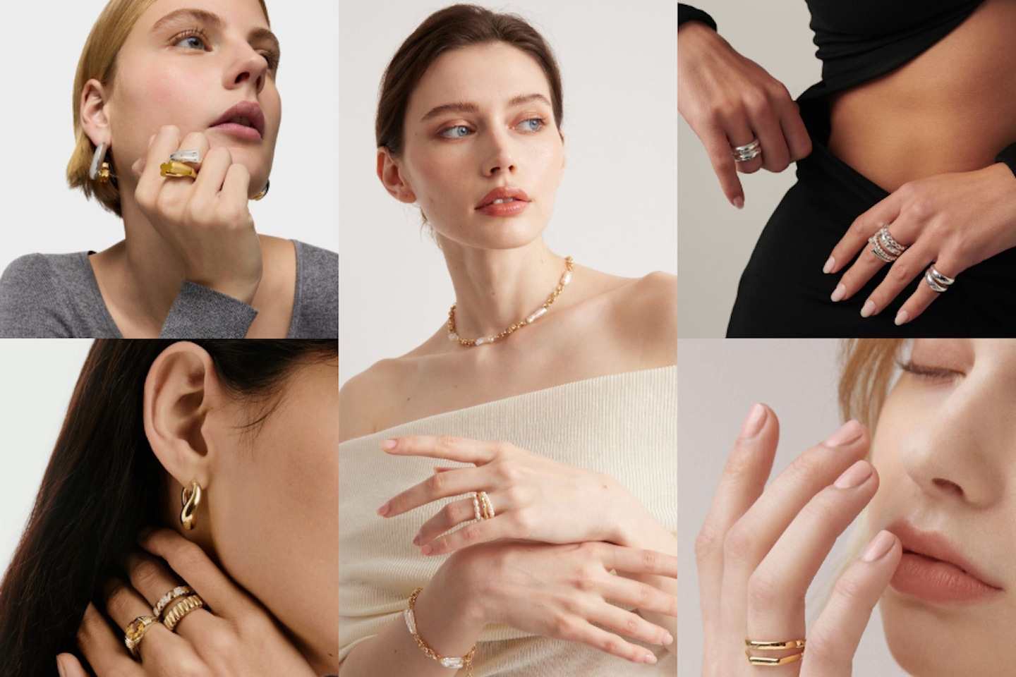 平均分配戒指在兩隻手上,反而容易讓視覺重心變得分散、缺乏記憶點。比較時髦的做法,是採取「非對稱平衡」,將設計感比較強的款式或是多個戒指集中在單隻手的 1~2 根手指上,另一手則維持簡約,甚至留白。這種「單手重點」的配置,能夠清楚的建立視覺焦點,透過「不對稱」帶出的張力,讓整體造型變得更有層次與個性,使戒指成為富有設計感的加分細節,而非制式堆疊的裝飾。