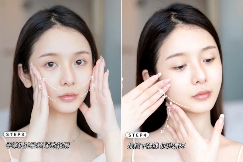 接著以雙手大拇指勾住下頜線,手掌輕撫臉頰往耳朵方向拉提,把整張臉「向上提」的感覺;最後一手沿著「下頜線→耳前」按摩,另一手輕撫「頸部→鎖骨」促進循環,幫助老廢物質排出。
