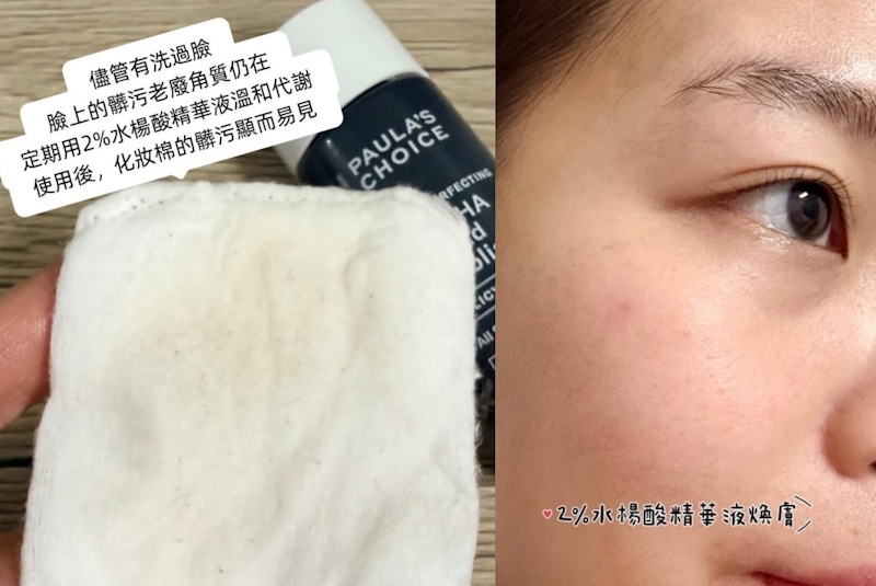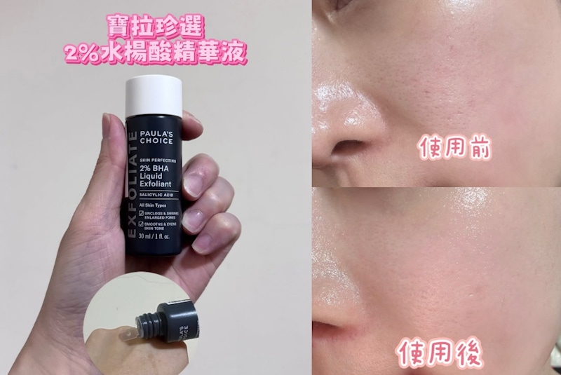 網友lillia分享:「清潔肌膚後,先用『2%水楊酸精華液』溫和代謝煥膚,特別加強在鼻翼兩側與下巴容易長粉刺、黑頭的小區域。」質地清爽好吸收,使用過程沒有刺痛或不適感,對敏弱膚質相當友善:「持續使用,明顯感覺毛孔乾淨、膚觸細緻許多,整體肌膚看起來更加透亮!」