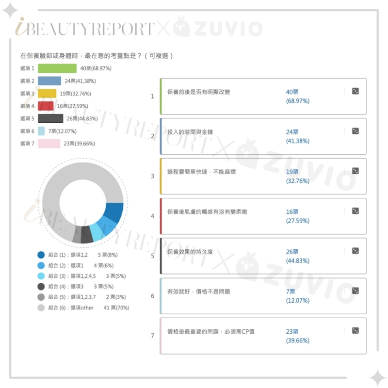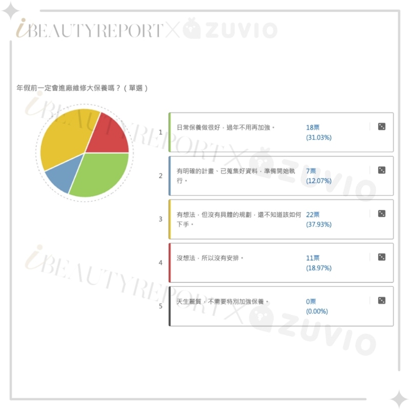 這個答案反映了現代人在資訊過載環境下所面臨的決策焦慮。面對種類繁多的醫美療程與保養課程時,雖然多數人有改善外貌的動機,但可能會因為缺乏專業判斷、擔心潛在風險而遲遲停留在觀望階段,而這樣的結果同時也凸顯了「專業諮詢」與「客製化建議」在保養市場中的重要性。對這些作答者來說,他們真正需要的不是推銷話術,而是基於個人膚質與實際需求的理性引導,才能協助他們安心的踏出第一步。