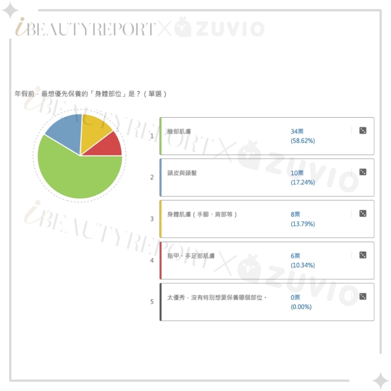 「臉部肌膚」成為 TOP 1 的結果,再次凸顯了臉蛋作為「視覺第一印象」的關鍵地位。在過年這種需要頻繁合照、社交的情境下,臉部狀態往往會直接影響到一個人的精神與自信程度,因此多數人會選擇將保養資源優先集中在臉部,著重保濕、提亮、改善細紋等。這樣的取捨其實蠻符合社會心理學的預期,將有限的時間與預算,投注在最容易被看見、最具「投資報酬率」的部位上,是一種相對務實、高效的選擇。