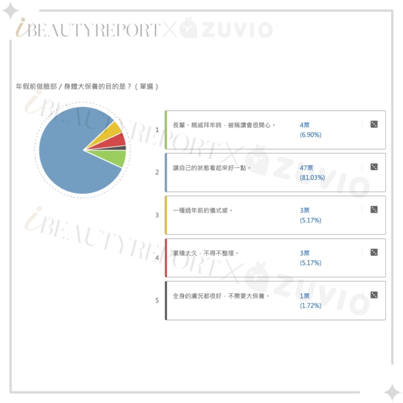 約 5% 的作答者將保養視為過年前「除舊佈新」的一環,這樣的心態與「新年大掃除」相當接近,都是希望能在過年之前,重新整理累積一整年的身體疲勞與肌膚狀況。「一種過年前的儀式感」與「累積太久,不得不整理」兩個選項的票數相同,反映出保養動機也可能同時結合了情緒與實際需求。對他們來說,保養不只是外在的調整,更是一種心理上的重啟與斷捨離,讓自己能以較為清爽、歸零的狀態,迎接全新的一年。