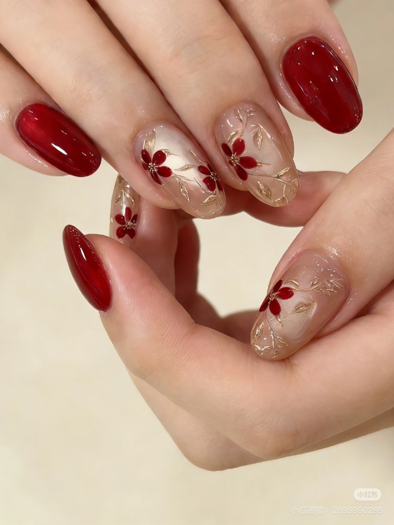 紅色小花美甲以精緻的手繪花瓣搭配帶有透明感的金色枝枒,呈現出充滿年味的清新質感。細緻的繪畫手法與深淺變化,使甲面上的花卉圖案變得更加立體,同時也能有效弱化大面積紅色帶來的厚重感。小花元素象徵著「花開富貴」,既能保留新年應有的吉祥寓意,同時又不會顯得過於張揚;整體風格優雅、耐看,即使農曆春節已過,也能自然的銜接日常生活,是一款兼具美感與實用性的新年美甲選擇。