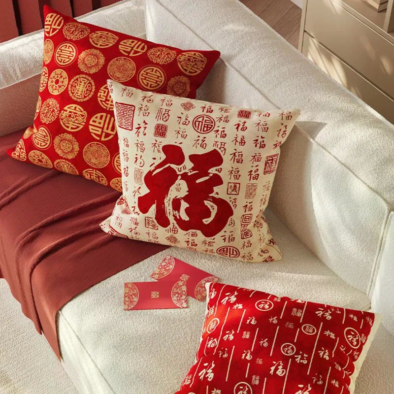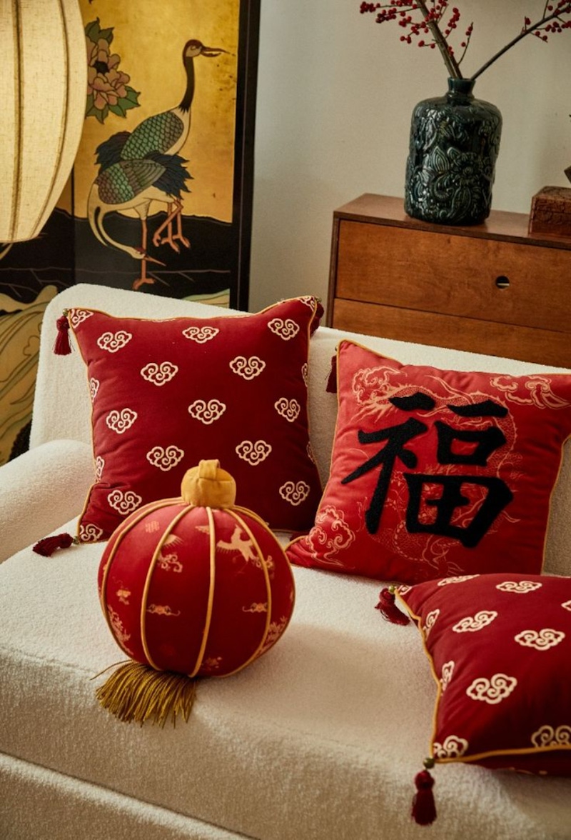 抱枕,是調整室內風格成本最低的小工具。將客廳沙發上的日常抱枕更換成紅色、金色或是帶有新年圖騰的款式,能夠迅速改變整個空間的冷暖調性。這樣的佈置邏輯是利用大面積的色塊來營造喜慶感,同時增加親友聚會時的舒適度;選擇絲絨、緹花材質的年節抱枕,不僅觸感柔軟,還能透過材質的反射光澤,在不改動家具的前提下,展現出節日的華麗氣息。