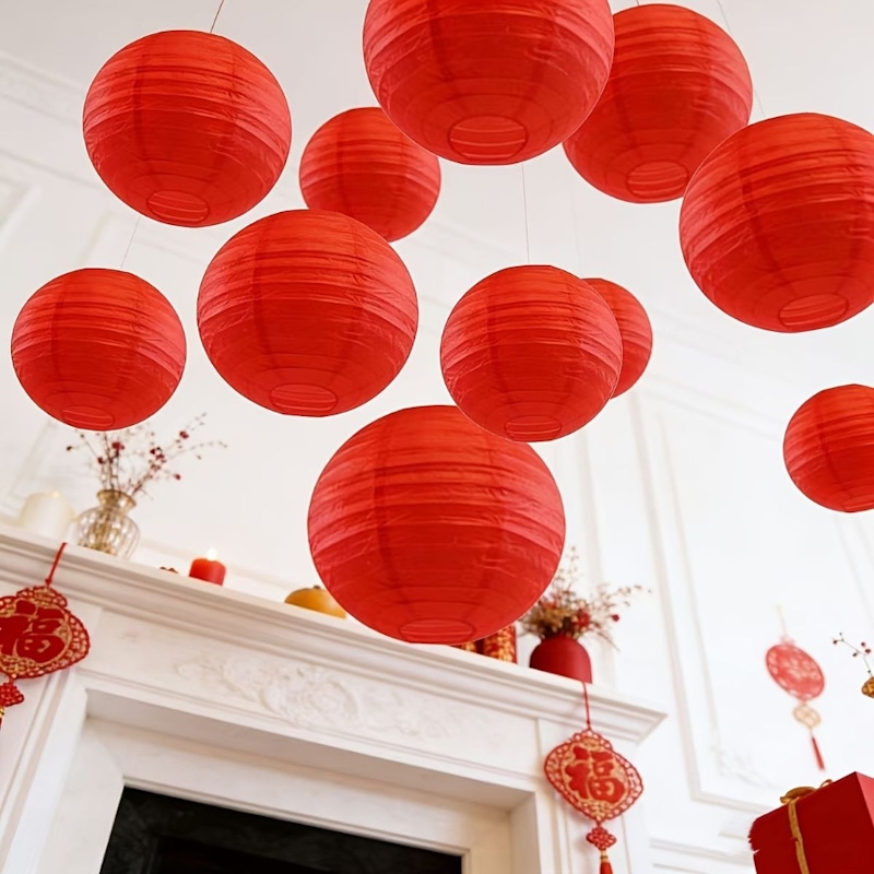 紅色燈籠自古以來就具備「指引」與「團圓」的意涵,懸掛在陽台、客廳角落,能夠營造出溫馨的垂直視覺美。現代的室內燈籠多採用簡約的球形設計,有些更結合了 LED 光源,既安全又環保;燈籠散發出的紅潤光澤,能夠柔化室內的稜角,為團圓的氛圍增添幾分柔和感,讓家中的每一處都能充滿暖意與喜氣。