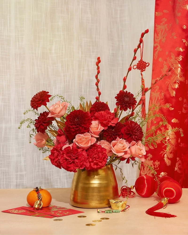 春節花藝常會選用具備吉祥寓意的花卉,像是:蘭花、牡丹、銀柳、梅花等。花藝佈置不應該過於繁雜,建議選擇一、兩款主花,並適度利用綠葉與應景的紅果來裝飾即可。鮮花的生命力能夠為靜止的室內空間注入流動的生機,花朵自然的芬芳也能提升居住者的活力與情緒;只要將年節花禮放置在玄關或是邊几,就可以讓人在推開門的那一剎那,直接的感受到春節的年味氣息。