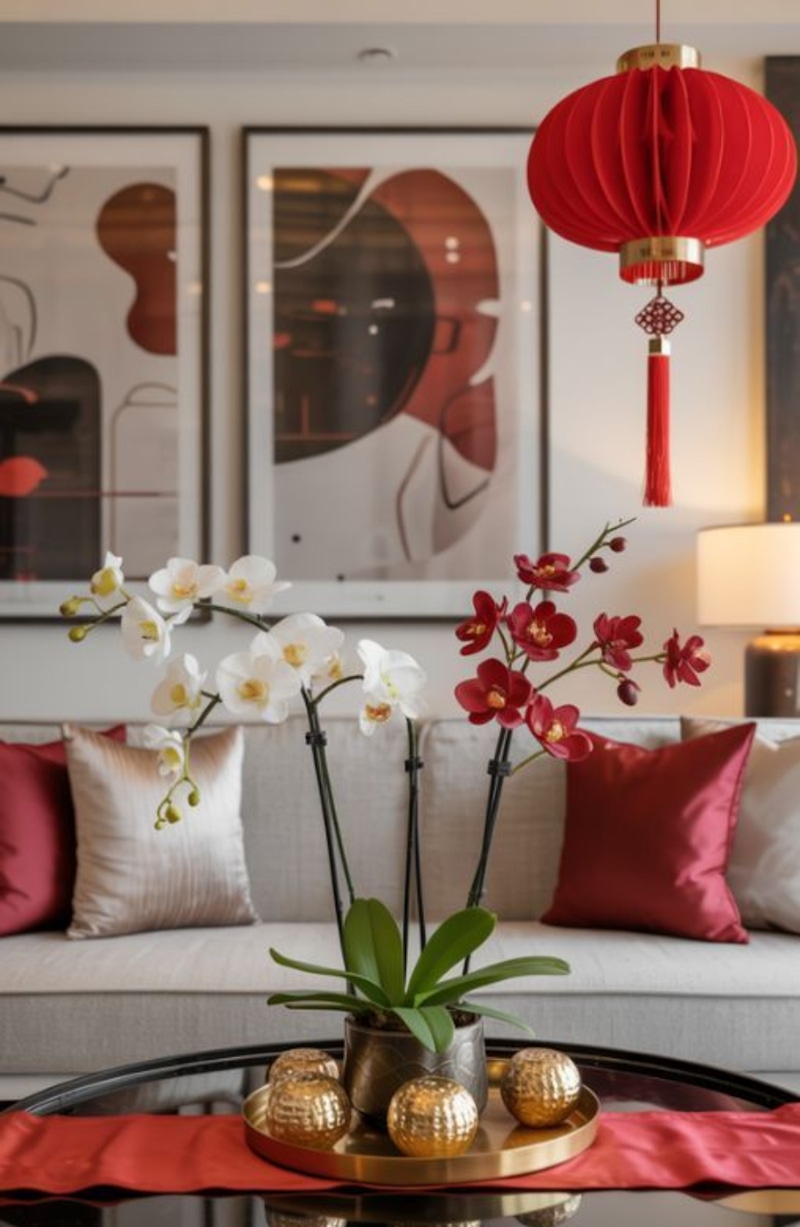 農曆春節的居家佈置重點在於:透過適度的裝飾,營造出溫暖、充滿喜氣的節慶氛圍。整體色調可以以「紅色」為主軸,並搭配春聯、紅燈籠、窗花等傳統元素,讓空間快速的進入過年狀態;再使用金色、銀色的小型裝飾,增加層次與亮點。「花卉」也是不可或缺的元素,梅花、蘭花、牡丹等傳統的吉祥花,不僅能讓家中環境更有生氣,同時也象徵著新年的好兆頭。餐桌與燈光則可以稍作調整,鋪上年味十足的桌巾、擺放水果,並提高整體照明的溫暖度,能讓居家空間更顯親切。元素不用太多,只要掌握紅色主調、吉祥象徵與整潔協調,就能讓家裡自然的散發出過年的熱鬧感囉!